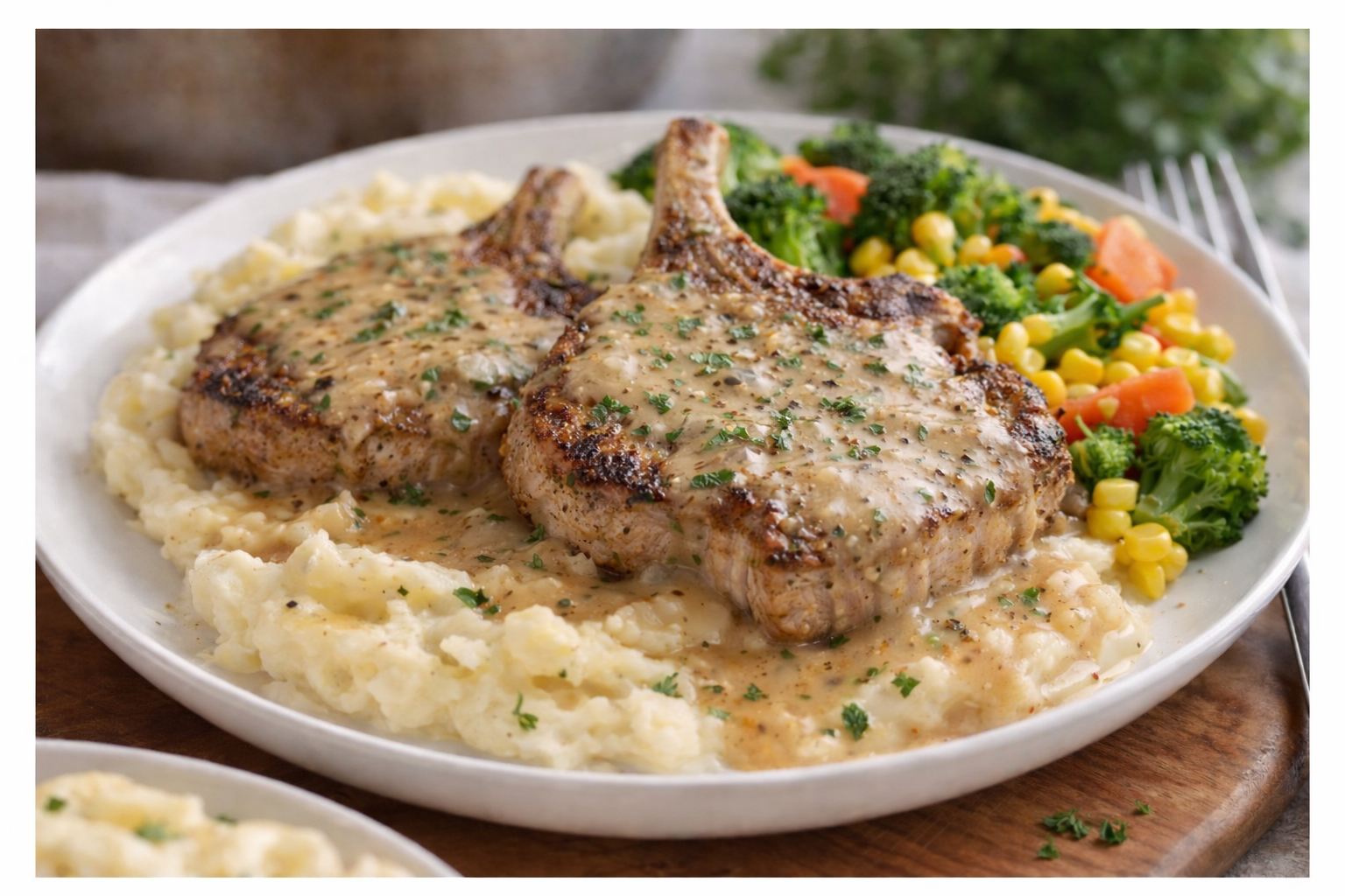 This is the meal I make when I want dinner to feel handled. When I don’t want questions, commentary, or a second round of decisions. Pork chops browned just right, gravy made from what’s already in the pan, and a plate that feels steady the moment it hits the table.